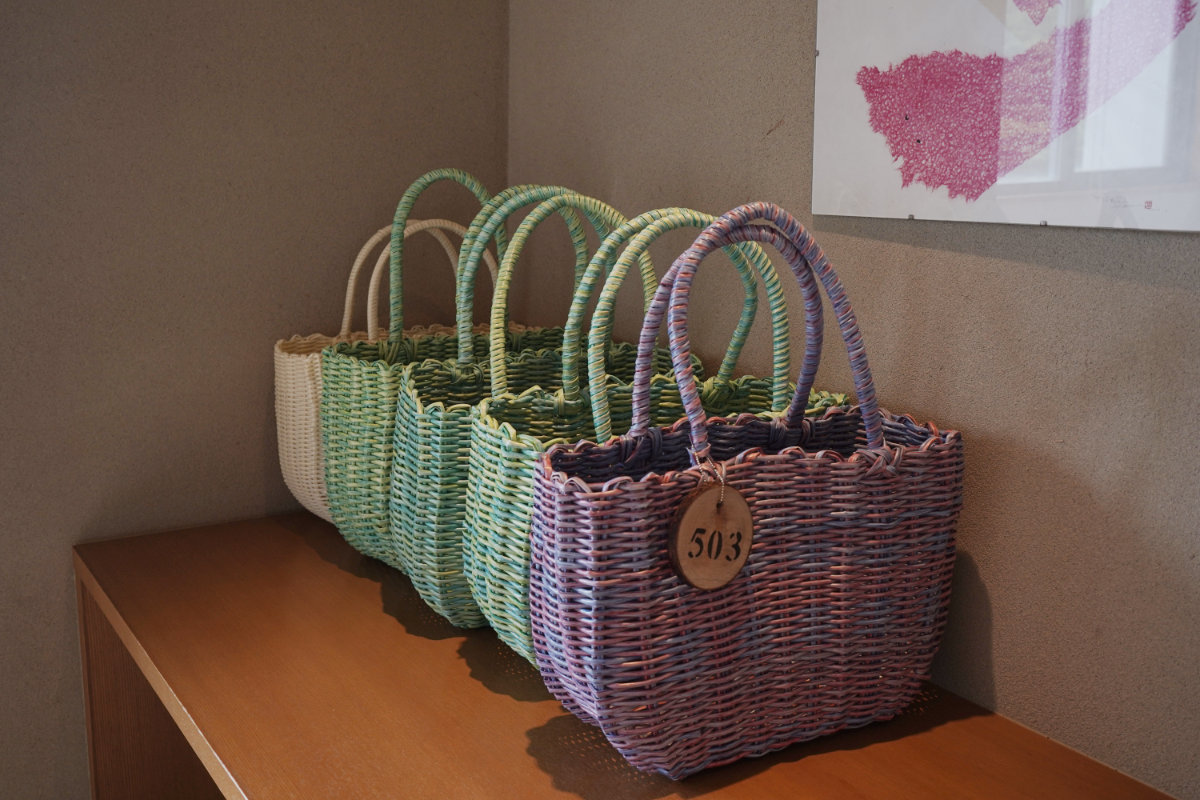 タオルや着替えを入れる「おふろかご」。客室棟から温泉棟は少し離れているが、途中には、景色を眺めたり売店に寄ったりすることもできる。そういう時に、カゴがあったら便利だし気が利いている。